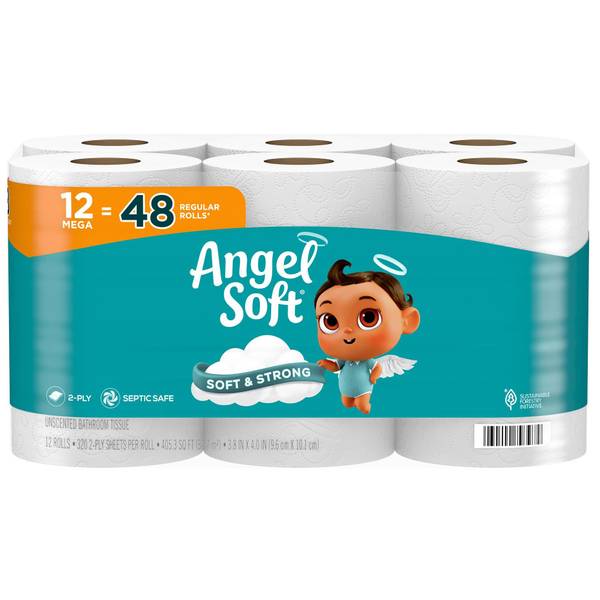 Here's something to harp on-Angel Soft Mega Rolls last and last with rolls that are 4 times as big as our Regular Rolls. With 320 2-ply sheets on every Mega Roll, you'll always have plenty of the softness and strength you love on hand. Plus, each generously sized roll still fits harmoniously in most standard bathroom toilet paper holders. And like all your favorite Angel Soft products, our Mega Rolls are flushable and septic safe in well-maintained sewer and septic systems. Angel Soft Toilet Paper. Soft and strong. Simple.