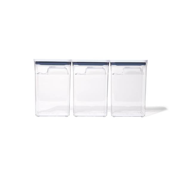 Stocking up on economy-size essentials? The OXO Soft Works 6-Piece POP Container Bulk Set is made just for you. Three 4.4 Qt Containers are perfect for storing bulk staples like 5 lb bags of flour, sugar and snacks, and the three included ½ cup Scoops make measuring and serving a cinch. Airtight, stackable, space-efficient, and now completely dishwasher safe, these food storage Containers can be customized to fit any space. With a handy fill line to guide you, curved corners for smooth dispensing and sturdy, BPA-free construction POP containers take tidying to the next level. POP Containers aren't just for pantries: use them any place you want more organization. For best results, always use the button to open and close. Do not carry POP Containers by the lid. Set includes: Three 4.4 Qt Containers ideal for storing 5 lb bags of flour, sugar and other economy-sized staples, and three handy ½ cup scoops that neatly attach to the underside of POP Container lids.