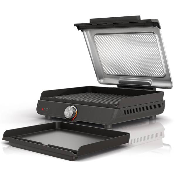 Meet the Ninja Sizzle, the compact cooking system that high-heat grills and griddles your favorite meals right from your countertop. Reaching temps up to 500 F, achieve the perfect char-grilled marks with direct, edge-to-edge even heat. Satisfy any meal craving using the interchangeable grill and griddle plates, from fluffy pancakes to tender chicken breasts that the whole family will enjoy.
